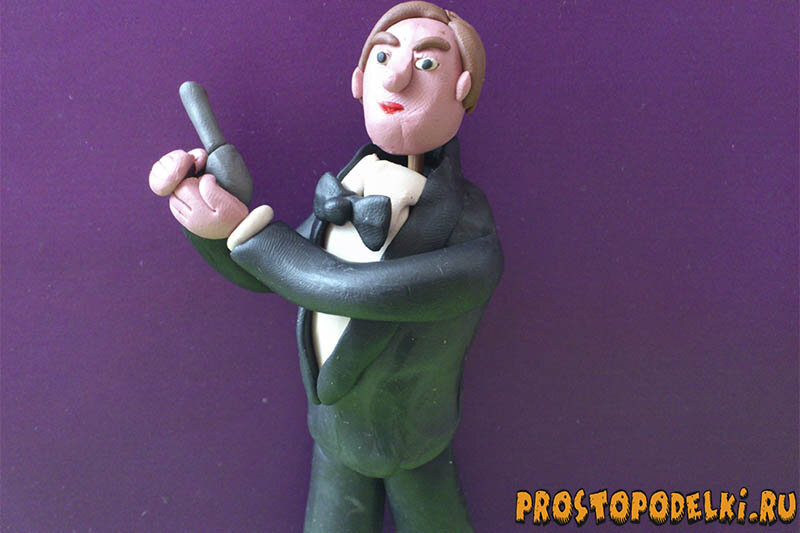 На страницах нашего сайта уже представлено немало интересных поделок из пластилина для детей. Мы уже научились лепить фигурки животных, игрушки, мультгероев. А хотите ли вы научиться создавать своими руками героев кино? Поверьте, в такой работе для вас не будет ничего сложного, если вы освоили предыдущие уроки лепки. Пластилин позволяет творить все, даже копии людей, вот такой уникальный и заманчивый материал. И ваш ребенок тоже захочет обязательно попробовать, главное, порекомендуйте правильно этот мастер-класс. В этом уроке рассказано, как создать своими руками настоящего суперагента. Даже неважно смотрели вы фильмы с их участием или нет. Одновременно мы научимся лепить мужчину из пластилина. Такие знания вам тоже могут пригодиться. Для создания намеченной поделки подготовьте: Как слепить суперагента из пластилина: В нашем случае можно использовать всего 3 оттенка пластилина. Из черного и белого мы создадим костюм, поскольку мы копируем конкретного персонажа, то нужно одеть его строг