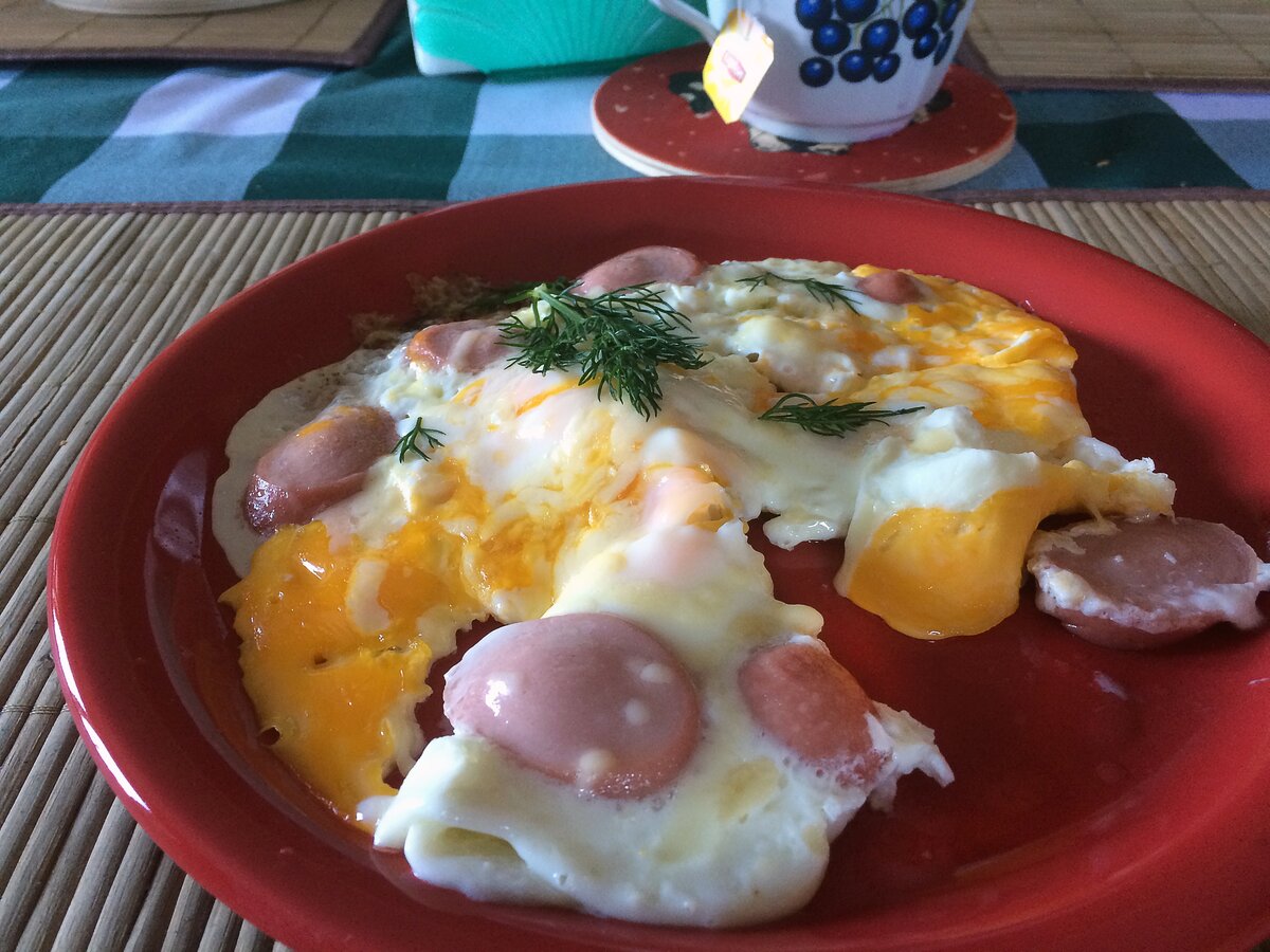 На фото простая яичница. Чуть ниже два оригинальных рецепта из яиц. Яичница в хлебе. После многочисленных уроков мастерства, которые я преподал жене, она на завтрак порадовала меня оригинальной яичницей. Ломтики хлеба толщиной в 1,5 см. Удалить мякиш, обжарить корочку хлеба на сливочном масле с одной стороны, перевернуть и залить в каждый ломтик хлеба одно яйцо. Через минуту положить в яйцо добавить мелко нарезанную колбасу, закрыть крышкой и жарить три минуты. Это всё. И самый просто омлет. Разбиваем в стакан два яйца, добавляем 30 гр. молока, мелко режем колбасу или сосиску. Все это выкладываем в форму, закрываем крышкой и в микроволновку на 4,5 минутфы. Всё. Омлет готов. Понравились рецепты – жду лайк, мне будет ясно, что вам понравилось.