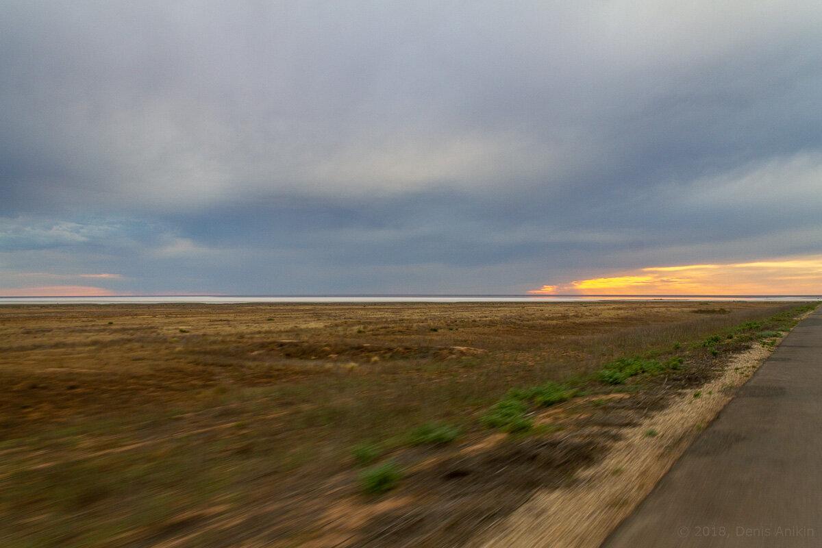Это была уже, кажется, шестая поездка на солёное озеро Эльтон, которое находится в степях Волгоградской области у границы с Казахстаном. Всё пытаюсь застать на нём закат, это должно быть красиво, но каждый раз не выходит. Вот и в этот раз выехал уже поздновато, навигатор сообщал, что минут на 20 опоздаю... Но дороги тут пустые и почти прямые, и, хотя и не очень хорошие, ехать можно быстро. В итоге, за 40 минут до заката на горизонте показалось озеро — вон та белая полоска. Но и тучами заволокло и только немного пробивался свет там, где должно было сесть солнце. Несмотря на то, что времени оставалось ещё полно, надо успеть и до воды добраться. Тут же заповедник, и въезд на озеро запрещён. Есть дорога, идущая по насыпи немного вглубь озера, но ей, видимо, пользуется только расположенный тут рядом санаторий, и кто-то ещё внаглую едёт. Для законопослушных же — шлагбаум и дальше 2,5 километра пешком. Идём быстро, чтобы успеть. Сначала 1,5 километра по этой косе. Весной тут вокруг вода, а