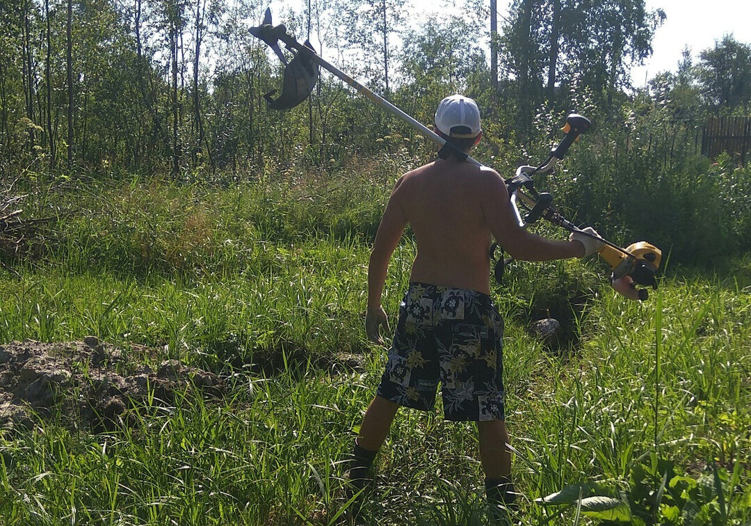 Вчера, не смотря на жару, мы решили очистить участок от выросшей травы и кустарников ивы. Взяли с собой помощника в виде бензинового триммера. Кстати, в предыдущем году мы косили исключительно косой :) Началось всё хорошо. Коса косит, солнце жарит. И в один прекрасный момент ломается нижняя часть косы. Всё разваливается, а пружина, которая была внутри, улетает в неизвестном направлении. В итоге на поиски этой пружины ушло где-то минут 40, но она так найдена и не была. После осмотра развалившейся части стало понятно, что пружина уже и не поможет. Где-то на мгновение пришло расстройство, что так и не удастся всё скосить и останутся начатые островки покошенной травы. Но отчаяние не наше. Взяли саморез и закрепили нижнюю часть. Так сказать, "заколхозили" :) В итоге коса ещё работала около двух часов и успешно справилась с оставшейся травой и кустарниками. Усталость плюс жара дали свой результат. Участок у нас ещё не очень ровный. Поэтому некоторые места косить было довольно проблематично.