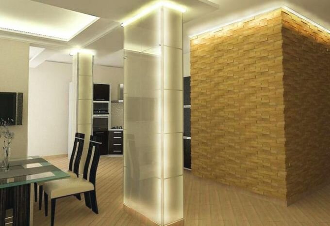 Способ 1. Используем колонны как опоры для мебели Используйте колонну как своеобразный центр для расстановки мебели. Например, колонну в гостиной можно превратить в опору для небольшого бара или стеллажей с коллекциями минералов, на кухне вокруг колонны можно сделать удобный островок в американском стиле, в кабинете она поможет создать небольшую, но комфортную библиотечную зону. Способ 2. Используем колонны для зонирования помещения Выстроить стены в квартире свободной планировки можно попытаться таким образом, чтобы имеющиеся колонны как бы де