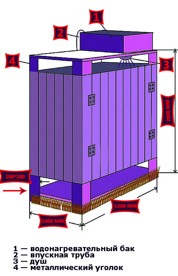 Как построить летний душ на даче? Каждый дачник, в жару после тяжелой работы на огороде или в саду, не откажется охладиться под душем. В жаркое летнее время, душ не является роскошью, это скорее необходимая постройка, обеспечивающая такой нужный нам комфорт. Зачастую такая постройка в своем исполнении довольна проста, если конечно вы не хотите строить элитную постройку. Создаем небольшой строительный проект. При помощи карандаша и бумаги, начертите эскиз будущего строения с указанием его габаритов. Проект поможет визуально увидеть будущий душ, поможет рассчитать расход строительного материала и выйти на итоговую сумму всего строительства. Не стоит забывать о том, что перед проектированием выбрать правильное место строения. Размеры и схема душевой кабины Как вариант можно придерживаться стандартных размеров душевой кабинки (1.2*1*2м), но тут дело хозяйское и размеры могут быть абсолютно разными. Где должен располагаться летний душ? Довольно распространенным местом для душа, считается с