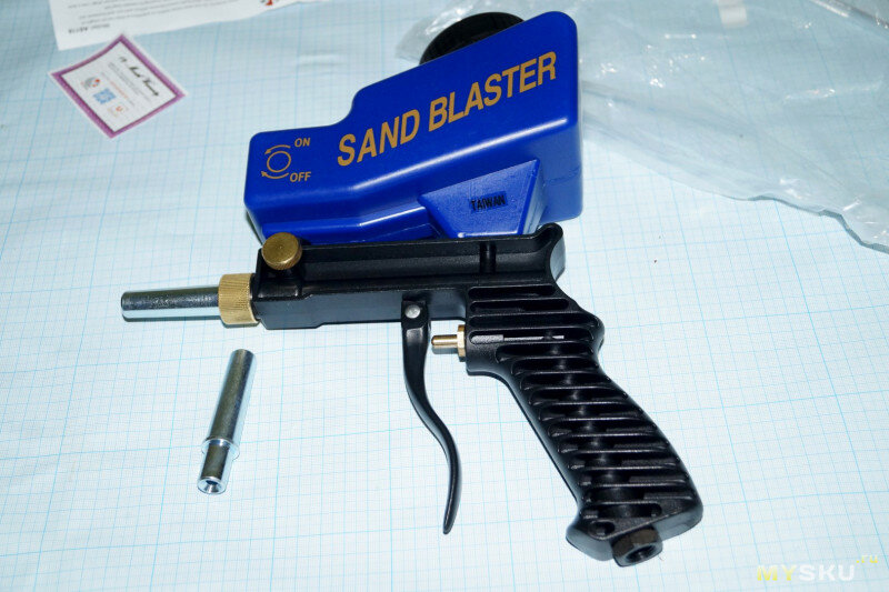 Всем привет! Сегодня посмотрим на довольно компактный пескоструйный пистолет. Вообще правильно было бы назвать его абразивоструйным, т.к. можно применять не только песок, но и другие абразивные материалы — карбид кремния, купешлак, пластик, электрокорунд, органика. Для бережной чистки часто используют соду — она практически не разрушает основной материал в отличие от тяжелых частиц песка, так что можно смело чистить керамику, мягкие металлы. Для работы нужен будет компрессор. Так же обязательно необходимо использовать средства защиты органов зрения и дыхания. Specifications: Рабочее давление: 70-150psi(3,5-10 бар)
