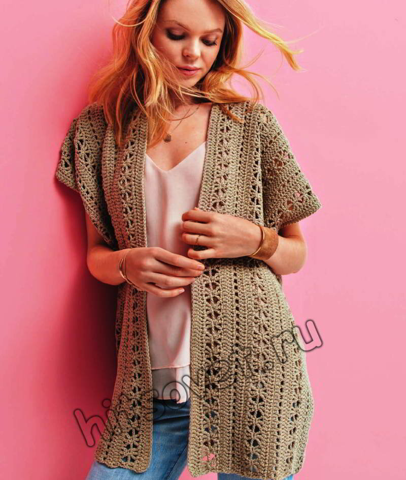 Вязание крючком для женщин стильного удлиненного жилета со схемой и пошаговым бесплатным описанием. Размеры жилета: 34-40 (42-44, 46-52). Вам потребуется: 14 (15, 18) мотков бежевой пряжи Phil Madrague, состоящая из 100% хлопка, длиной нити 92 метра в 50 граммах; крючок № 5; маркировочные кольца. 2 столбика с 2 накидами провязать вместе: *2 накида, ввести крючок в петлю, вытянуть петлю, # 1 накид, протянуть нить через 2 петли на крючке #, выполнить от # до # 2 раза, выполнить от *до * 2 раза, вводя крючок в разные петли основания, затем сделать ещё 1 накид и пропустить нить через последние 3 петли на крючке. 3 столбика с 2 накидами провязать вместе: провязать, как 2 столбика с 2 накидами но повторить от * до * всего 3 раза, затем сделать ещё 1 накид и пропустить нить через 4 петли на крючке. Фантазийный узор: вязать по схеме. Повторять от * до *, то есть 4 петли раппорта и 7 рядов. Каждый ряд столбик с накидом начинать с 3 воздушных петель подъёма, эти петли считаются за 1-й столб