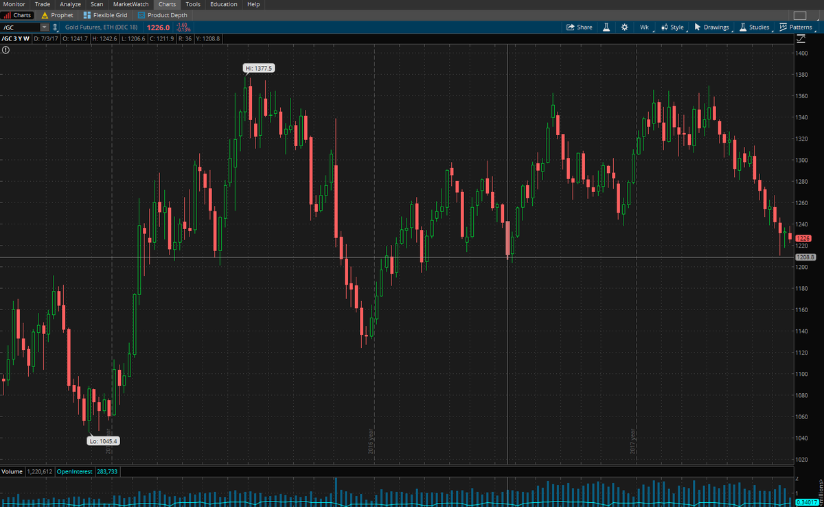 Я писал уже ранее, что действительно верю в то, что в прошлом году, если точнее 02.07.2017 мы видели разворотную точку на золоте с последующим подтверждением восходящего тренда. Хоть я и не торгую золото долгосрочно, и оно есть только в составе моей среднесрочной стратегии "7пар+золото", но тогда я советовал адептам металла прикупить его малым сайзом в портфель в качестве хеджа. Золото осталось стоять на месте, и то, что происходило дальше нельзя назвать трендовым движением. Золото мается в боковике, много объясняющих факторов для этого, и главный из них, конечно, укрепляющийся доллар и планомерное повышение ставки ФРС. Сегодня посмотрим на проблему золота с другой стороны, забудем про спрос как главный драйвер, а подумаем над предложением, ведь мы не забываем, что это редкий металл, кол-во которого ограничено рентабельностью добычи. Какие прогнозы дают добытчики золота и можно ли им верить? Разберём всё по полочкам. Самые лучшие товарные бычьи рынки как раз складывались на фоне деф