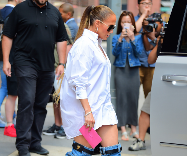 Вот это да! Новый неудачный выход Дженнифер Лопес Вчера Джен снова вышла в свет в одной белой рубашке и высоких ботфортах Versace (привет, Jenny from the block из нулевых). А теперь еще одно неудачное появление. Певица была сфотографирована на улице в Нью-Йорке после тренировки. И если к белой толстовке претензий нет, то вот к огромным очкам-авиаторам и леггинсам со змеиным принтом, которые совершенно невыигрышно выглядят на бедрах, вопросы имеются. Джен, сколько можно уже ? , может пора к стилисту?