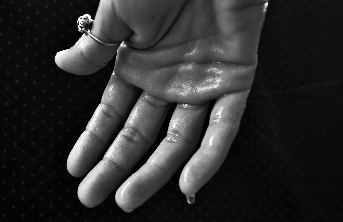 Потливость рук возникает как у мужчин, так и у женщин. При рукопожатии пот на руках поставит любого в неловкую и неприятную ситуацию. Часто эта проблема ощутима среди офисных сотрудников. Если у человека потные ладошки, то он постарается избежать рукопожатия, а это неприемлемо по правилам культурного поведения. Из-за чего ладони сильно потеют? Во-первых, каждый должен помнить, что влажные выделения на наших руках – это абсолютно природная, и, кстати, немаловажная функция организма. С помощью выделений через потные железы организм охлаждается, это индивидуальные процессы и они происходят у разных людей с разной интенсивностью. И если у Вас возникает потливость рук- не паникуйте. В случае, когда данный процесс доставляет большие неудобства, подумайте о естественных факторах, которыми он вызван. Причины появления потливости рук и ног: - употребление острой еды; - перенесение сильного волнения; - высока температура воздуха; - упражнения; - слишком активная интеллектуальная деятельность. Е