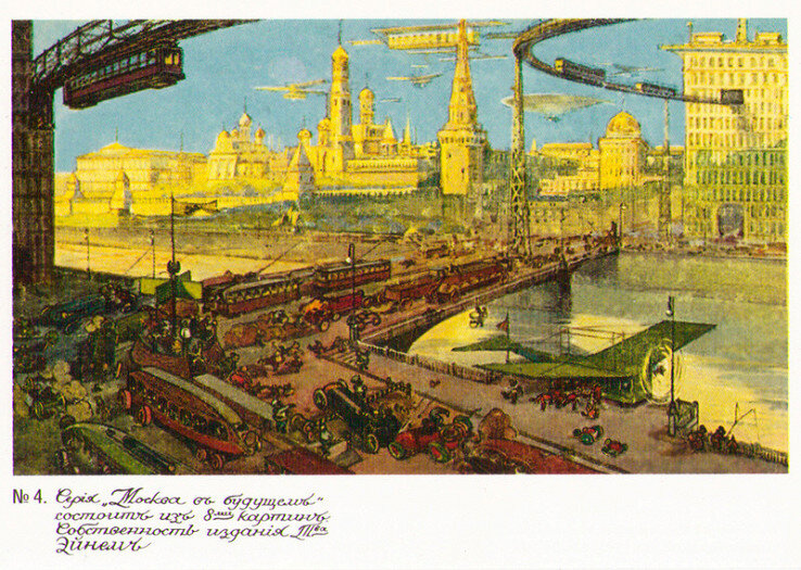 В 1914 году кондитерская фабрика «Эйнем» (нынешний «Красный Октябрь») заказала для рекламной акции серию открыток о Москве будущего. Художник-футурист (его имя неизвестно) должен был нарисовать столицу такой, какой он видит ее через 200-300 лет. Заказ был выполнен. В серию вошло несколько открыток с пояснениями. Петровский парк. "Повсюду бьют, сверкая, дивные фонтаны. Лишенный микробов и пыли, совершенно чистый воздух пронизывают дирижабли и экранопланы. Толпы людей в ярких костюмах 23 века наслаждаются дивною природою". Петербургское шоссе. "Красивая ясная зима 2259 года. Для удобства и приятности сообщения Санкт-Петербургское шоссе целиком превращено в кристально-ледяное зеркало, по которому летят, скользя, изящные аэросани". Москва-река. "По прозрачным волнам несутся огромные транспортные и торговые крейсеры и многоэтажные пассажирские пассажирские пароходы. Весь флот мира — исключительно торговый. Военный упразднен после мирного договора в Гааге". Театральная площадь. "Темп жизн