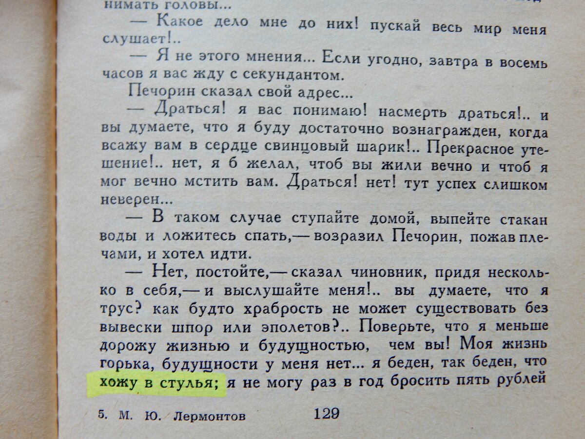 Вычитано в романе Лермонтова "Княгиня Лиговская". Вы читали "Княгиню Лиговскую"? Если читали, то наверняка уже погуглили, что значит ходить в стулья. Я читаю впервые, и только сегодня открыла для себя, что ходить стулья - это покупать дешёвые билеты в театр, в ту часть зала, где зрители сидят на стульях (а не, предполагаю, более дорогих креслах). Контекст: карета Печорина, он главный герой "Княгини", мчится по Петербургу и сбивает с ног чиновника по фамилии Красинский. Печорин, подобно, впрочем, и теперешним мажорам, даже не замечает, что чуть не задавил человека, и мчится себе дальше. Бедняга чиновник чо, встал, отряхнулся, ещё сильнее возненавидел богатых хамов в шикарных каретах с быстрыми лошадьми, ну и пошёл себе. Дальше они встречаются в театре. Печорин, понятно, не в курсе, а чиновник его узнаёт и претензию ему предъявляет, ах ты гад, меня чуть не задавил. Печорин - ой ну ты зануда, подумаешь, чуть не задавил. Ладно, давай дуэль, давай стреляться. Чиновник - не могу я с