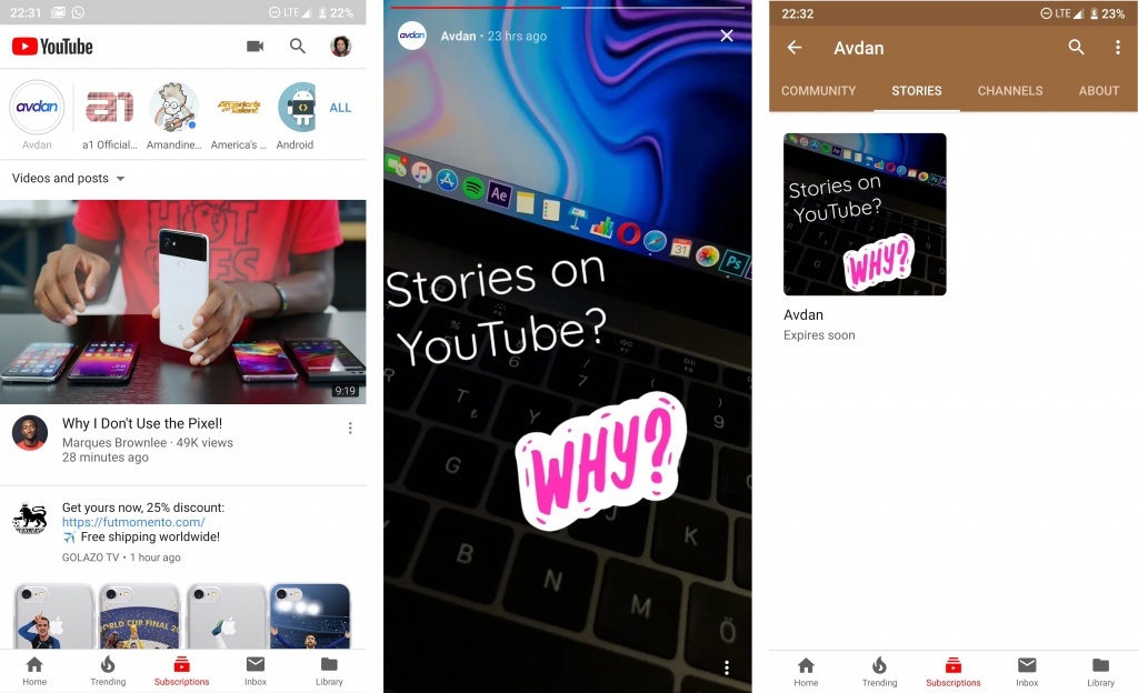 YouTube уже начал тестировать новое нововведение, а именно Истории. Они нечем не будут отличаться от историй в Instagram и Snapchat, как и в других сервиса, публикуются в виде круглых иконок, а новые посты выделены красной или синей окантовкой в зависимости от выбранной темы интерфейса. Единственное отличие от конкурентов -отсутствие возможности комментировать истории. В главном меню сверху будут видны истории людей, на которых ты подписан. Так же у канала появится новая вкладка "Истории", там будут показаны последние истории пользователя. Пока что тест Историй открытый, но для ограниченной аудитории. Когда выйдет обновление, пользователей оповестят.