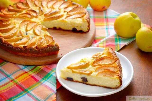Такая шарлотка на творожном тесте с яблоками особенно хороша для детей: если ребенок не ест творог в чистом виде - шарлотку он будет уплетать за обе щеки. На пирог весом 1 кг потребуется: 🍏 4 небольших яблока, 🍏 200 г творога, 🍏 50 г изюма, 🍏 4 яйца, 🍏 50 г муки, 🍏 1 ст.л. сливочного масла, 🍏 70 г панировочных сухарей, 🍏 щепотка соли, 🍏 корица, 🍏 0,5 ч.л. разрыхлителя, 🍏 подсластитель по вкусу Приготовление: 1. Взбить яйца с солью, добавить муку, корицу, разрыхлитель, творог и подсластитель. 2. В тесто добавить промытый изюм. 3. Яблоки почистить и нарезать дольками. 4. Форму смазать маслом и обсыпать панировочными сухарями, выложить тесто, а сверху украсить нарезанными яблоками, слегка вдавливая дольки внутрь пирога. 5. Запечь 35-40 минут при температуре 190 градусов. Калорийность и БЖУ: 146 ккал/100 г, белки: 7.3 г, жиры: 6 г, угдеводы: 15.8 г