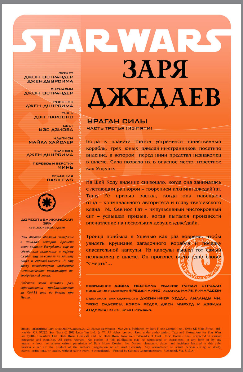 Троица учеников, ввязавшись в бой с незнакомцем в шлеме, назвавшимся Зешем, поняли, что имеют дело с человеком, обладающим и использующим Силу. Зеш, понимая, что ведёт бой не с простой троицей, решает скрыться от них в Бездне Ру. А тем временем, Дейген Лок (узник Богана), находящийся на тёмной луне наблюдает за ранее не виданным ураганом чудовищной силы, возникающим на Тайтоне. ____________ Предыдущий комикс (Заря джедаев: Ураган силы (часть 02/05) Следующий комикс (Заря джедаев: Ураган силы (часть 04/05) ____________ Предыдущий комикс (Заря джедаев: Ураган силы (часть 02/05) Следующий комикс (Заря джедаев: Ураган силы (часть 04/05) _______________________________________________________________________________________________________________ Спасибо, что дочитали до конца :-) Комикс переведён на русский язык командой swcomics.ru Cканы комикса взяты с этого общедоступного ресурса