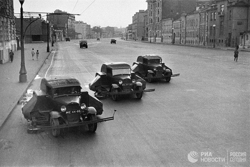 Подметально-поливальные машины, приводящие в порядок Москву в тридцатых, прямо как шлемы космического злодея из Звездных войн на колесах. Сейчас автомобили едут у здания юридической академии, а еще пару сотен метров и они прошуршат мимо находящегося на другой на другой стороне Садово-Кудринской дома - особняка Берии. Именно там главный советский злодей утаскивал к себе, как Синяя борода, малолетних школьниц.. По городской легенде его там и застрелили при задержании. Некоторые особо впечатлительные люди слышат , как поздно вечером подъезжает к этому особняку невидимая машина и чьи-то торопливые шаги следуют к дому. Одно из московских привидений..Сейчас там посольство Туниса или Алжира тоже с красным флагом, как при страшном хозяине, только полумесяц при звезде. вот тот дом , скрывшийся среди деревьев и за укрепленного поликарбонатом оградой..