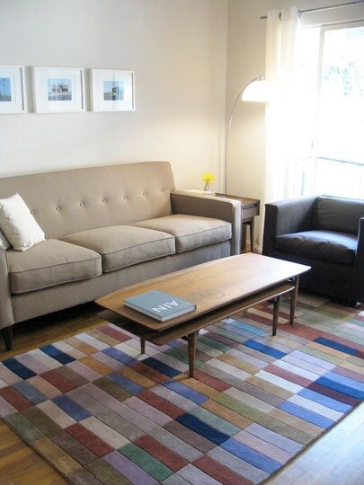 Идеальные размеры ковра – неиссякаемая тема для обсуждения дизайнеров интерьеров. Есть те, кто верит, что ковер должен охватывать всю зону отдыха с диваном и креслами, те, кто считают нормой использование маленьких ковриков в определенных обстановках, а также те, у кого есть собственная проверенная и надежная формула расчета точных размеров изделия. Все, конечно, зависит от личного вкуса, бюджета и особенностей комнаты. Подходов к этому вопросу много, и все они реально работают. Приведем пример нескольких из них. 1. В первом варианте изделие доходит ровно до края дивана и кресла в гостиной. Это работает, поскольку размер ковра велик настолько, чтобы обеспечить достаточно свободного места вокруг кофейного столика, его форма отражает расстановку самой мебели, а цветовая гамма дополняет нейтральные тона, в которых оформлена вся комната. 2. Во втором примере владельцы дома придерживаются классического правила, согласно которому ковер должен находиться под всей зоной размещения мягкой мебел