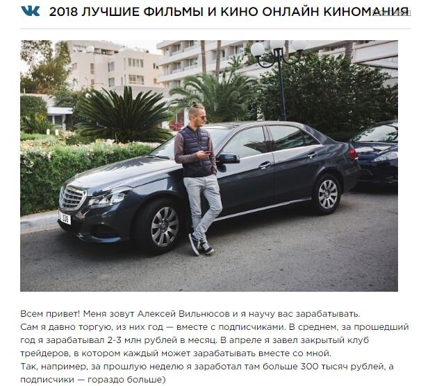 1. Кто такой Алексей Вильнюсов? В Телеграме и ВКонтакте всех задолбала навязчивая и агрессивная реклама какого-то Алексея Вильнюсова, который предлагает заработать бабла. И постит фотки с шикарной жизнью. Эта реклама уже стала мемом. 2. Что за реклама Алексея Вильнюсова? Причем реклама появляется в крупных каналах, которые обычно всякую фигню не постят, или в каналах вообще с тематикой не про бизнес, а, например, про кино: 3. Как заработать с Алексеем Вильнюсовым? Ну, походу, никак. Он предлагает своим последователям торговать бинарными опционами с помощью сервиса Olymp Trade. В интернете эту компанию обвиняют в обмане клиентов, и в том, что заработанные деньги нельзя вывести с сайта. 4. Отзывы об Алексее Вильнюсове Если загуглить его имя, то первые несколько ссылок - негативные отзывы. То же самое и о сервисе, на котором он предлагает заработать: 5. Мемы про Алексея Вильнюсова Привет, если вам понравилась статья — жмите лайк сбоку и подписывайтесь на канал. Так мы будем на связи и вы