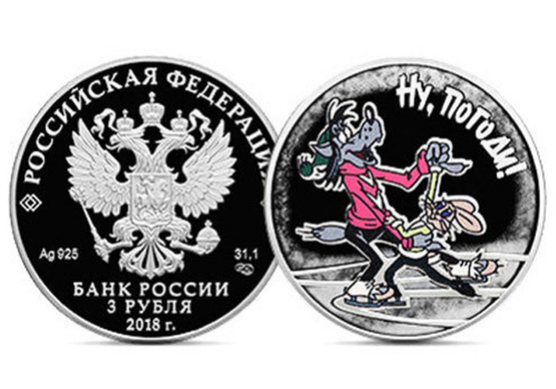Теперь гоняться за новыми редкими монетами, почти как волк за зайцем, в скором времени наверное начнут нумизматы. Центральный банк выпустил юбилейную серию монет номиналом 3 и 25 рублей с картинками из мультфильма «Ну, погоди!». Данный тираж монет приурочен к полувековому юбилею знаменитого мультфильма. Создателям новых монет весьма пришелся по душе образ Волка в розовом свитере-водолазке, в зеленой шапочке с помпоном и в коньках на пять размеров меньше с торчащими когтями. Из всех вариантов, которые были бы возможными, художники решили выбрать именно картинку из 8-го, новогоднего, выпуска «Ну, погоди!». А именно тот кадр, где Заяц и Волк на льду танцуют танго «Кумпарсита», как знаменитые фигуристы Пахомова и Горшков. «В оборот поступают серебряные монеты номиналом 3 рубля, отчеканенные тиражом 3 тысячи штук, а также монеты из недрагоценных металлов номиналом 25 рублей в обычном и специальном исполнениях. Тираж монет в обычном исполнении – 450 тысяч штук, в специальном (с цве