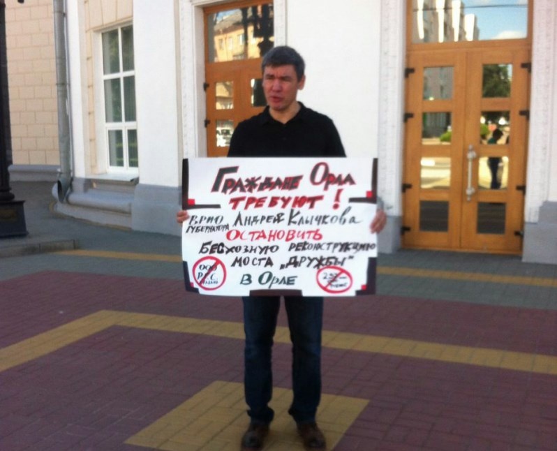 Активист Вадим Невров 3 августа вышел к стенам администрации Орловской области с пикетом. Он требует от врио главы региона Андрея Клычкова остановить «бесхозную» реконструкцию моста «Дружбы». Невров заявил, что выступает против контракта за 297 млн рублей с подрядчиком, «не имеющим опыта в данной сфере». Активист заявил корреспонденту «Орловских новостей», что мост не в таком плачевном состоянии, чтобы проводить полноценную реконструкцию. «Мосту достаточно ремонта и не за такие деньги», - считает Невров. Отметим, что в эти минуты в здании правительства области начинается заседание Совета безопасности РФ, которое проводит Николай Патрушев. Капитальный ремонт моста «Дружбы» должен был начаться еще в июне. Однако к этому времени власти не сумели найти подрядчика. В июле победителем конкурса стала фирма «Региональные газораспределительные сети» из Татарстана. Сроки ремонта – до 31 декабря 2019 года. На это время мост будет частично перекрыт. Как отмечали чиновники, завершение капитальног