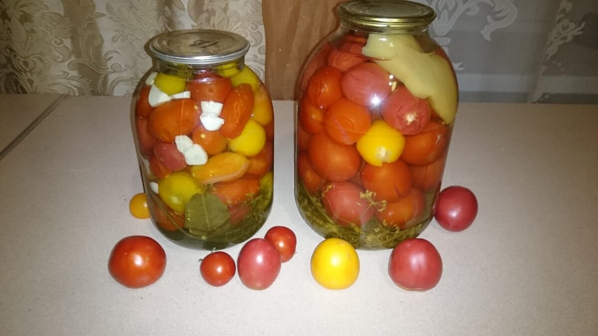 Заготовки на зиму моё любимое и полезное дело. Если заготовки делаешь своими руками, всё получается очень вкусно, магазинные с ними не сравнятся. Простыми рецептами я хочу с Вами поделиться. Помидоры на зиму-совершенно незаменимый вид заготовок. 1. Берём 3-х литровые банки (не бойтесь брать такие банки, помидоры в банке не останутся). 2.Простерилизуем их и крышки. 3. Вырезаем плодоношки и кладем туда кусочек чеснока. 4. Заполняем помидорами банки и заливаем кипятком. Стоят так 10 мин., после всю воду из банки выливаем в раковину. 5. Второй раз заливаем помидоры кипятком. Немного дать им постоять и вылить в кастрюлю. Положить туда же 2 ст.л. соли, 10 ст.л. сахара, 4 ст. л. 9% уксуса. Доводим до кипения, заливаем помидоры и закрываем. Как видите, всё очень просто. Приятного аппетита!