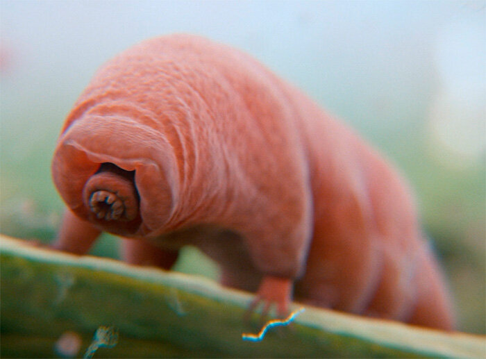 Тихоходки – это микроскопические, длинной не более 1.5 миллиметра, беспозвоночные животные. Впервые они были описаны в 1773 году немецким пастором И. А. Гёце, который дал им имя kleiner Wasserbär или «маленький водяной медведь». Позднее, в 1777 году итальянский учёный Ладзаро Спалланцани назвал их il tardigrado («тихоходки») – это название стало официальным. Тело у тихоходок полупрозрачное и состоит из четырёх сегментов и головы. На каждом из сегментов по две ноги. Передвигаются тихоходки, и правда, очень медленно — всего 2-3 мм в минуту. А обитают они во влажной среде: в пресноводных водоёмах, сырой почве, на влажных мхах и лишайниках. Если же влаги для их жизнедеятельности не хватает, они впадают в анабиоз. И это самое интересное! В состоянии анабиоза тихоходки могут находиться десятки лет. И даже через 100 лет засушенную тихоходку можно разбудить с помощью капли воды. Равных среди живых существ по выносливости в экстремальных условиях у тихоходок просто нет. Ученые экспериментально