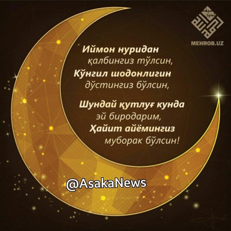 Қурбон ҳайитингиз муборак бўлсин. Ушбу улуг кунлар барчамизнинг калбимизга улугбахш сокинликни олиб келсин. Иймон нурлари йулларимиз хамда калбимизни ёритиб турсин азизлар . улуг аййем муборак булсин.