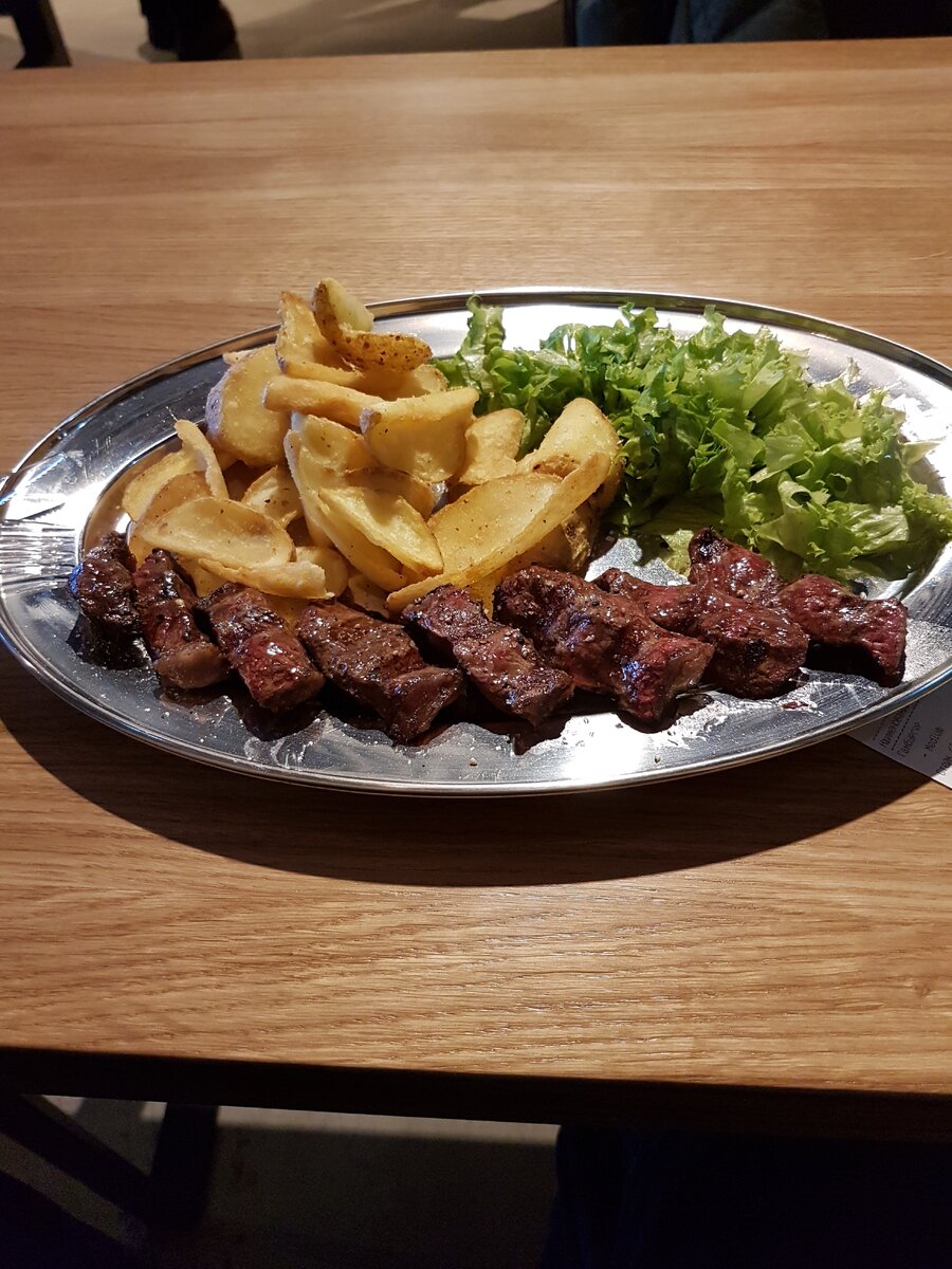 Всем привет! Давненько не было рассказа о мясе, причем о мясе "по быстрому"! Поделюсь, пожалуй, своими впечатлениями о стейке из новиковской бургерной FARШ. Итак, мираторговский стейк с картофельными слайсами: Да, порезан. Но в заведении лишь пластиковые ножи и вилки, которые справляются с мясом все-таки с трудом. Все картинки кликабельны и доступны в высоком разрешении! Мягкое, сочное, нежное мясо с насыщенным вкусом. И, как мне кажется, на фото это очень хорошо видно :) Слайсы напоминают не полностью высушенные чипсы, хорошая альтернатива фри и "деревне", я специально не брал к ним соус. Салат же приятно удивил наличием щавеля, судя по характерной кислинке. На уровне ли BlackStar Prime, безотносительно сервиса? Близко, но нет, не говоря уже о разных классах заведений. Но совершенно точно, что лучше чем в "Хищнике"(несмотря на отсутствие приборов и крепкого алкоголя, есть куча разного пива). Сразу скажу, я не являюсь поклонником этого заведения, и к моему собственному великому у