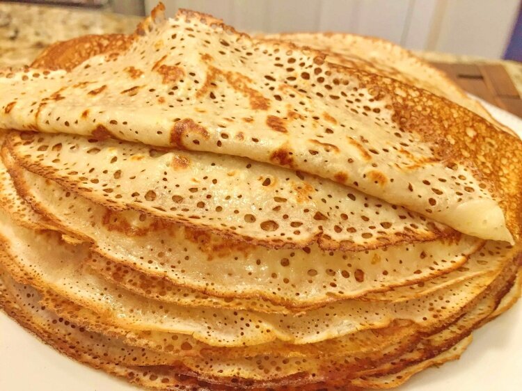 Постоянно балую родных такими блинчиками. Они даже остыть толком не успевают, как их уже сметают со стола. Идеальный завтрак обеспечен. Всем советую! Приготовление: Секрет таких блинчиков в особом тесте. Вот мы и займемся его приготовлением. Сначала мы подогреваем 0,8 литра молока. Половину отливаем в отдельную миску. Во вторую часть добавляем дрожжи – их нужно взять 30 грамм. Когда они разойдутся, разбиваем в тесто 3 яйца, кладем 2 столовых ложки сахара и солим. Все как следует перемешиваем. В другую миску кладем 3 стакана муки. Доливаем туда дрожжевую массу и смешиваем, не давая образоваться комочкам. Оставляем тесто в теплом месте на полчаса. Когда оно станет пышным, доливаем оставшееся молоко, не забывая помешивать. Тесто готово, можно сразу же выпекать на сковороде. Каждый блинчик хорошо бы намазать сливочным маслом. Кушать можно со сметаной, сгущенкой или вареньем. Приятного аппетита!