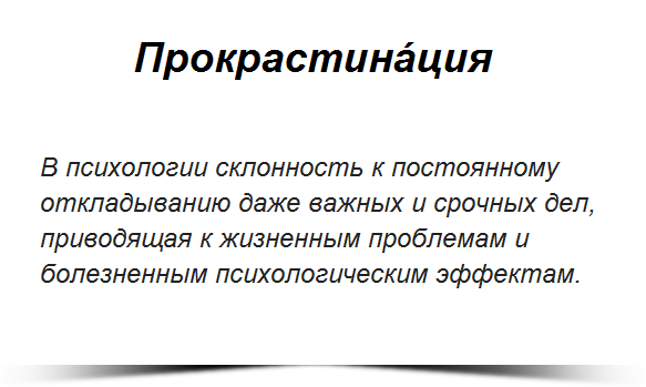 Если вы постоянно откладываете важные дела, которые необходимо решать в первую очередь, то для вас плохие новости… Факты о прокрастинации Более 20% людей являются хроническими прокрастинаторами и живут с этим, не осознавая, что это серьёзный недуг и избавление от него нельзя откладывать на завтра, чем собственно они и занимаются. В большинстве случаев прокрастинации подвержены перфекционисты, те самые у которых всё всегда должно быть идеально в совершенстве. Они зацикливаются на мелочах, деталях. Но всему нужна мера и избыток её может негативно повлиять на качество жизни. Прокрастинаторы всегда отвлекаются на маловажные дела, делая это подсознательно, находят отвлекающие моменты автоматически, игнорируя самые нужные задачи. Хотелось бы дописать и добавить ценной информации на данную тему о способах избавления от этой вредной привычки, впрочем, потом…