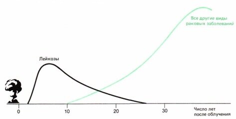 Время появления дополнительных к спонтану раковых заболеваний с момента атомной бомбардировки. Раньше всего – через 2 года - развиваются лейкозы. Прирост по другим видам раковых заболеваний обнаруживается через 10 лет.