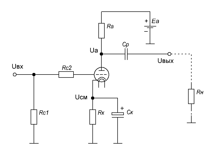 Схема усилительного каскада на вакуумном триоде с резистивной нагрузкой (реостатный усилитель) представлена на рисунке ниже.