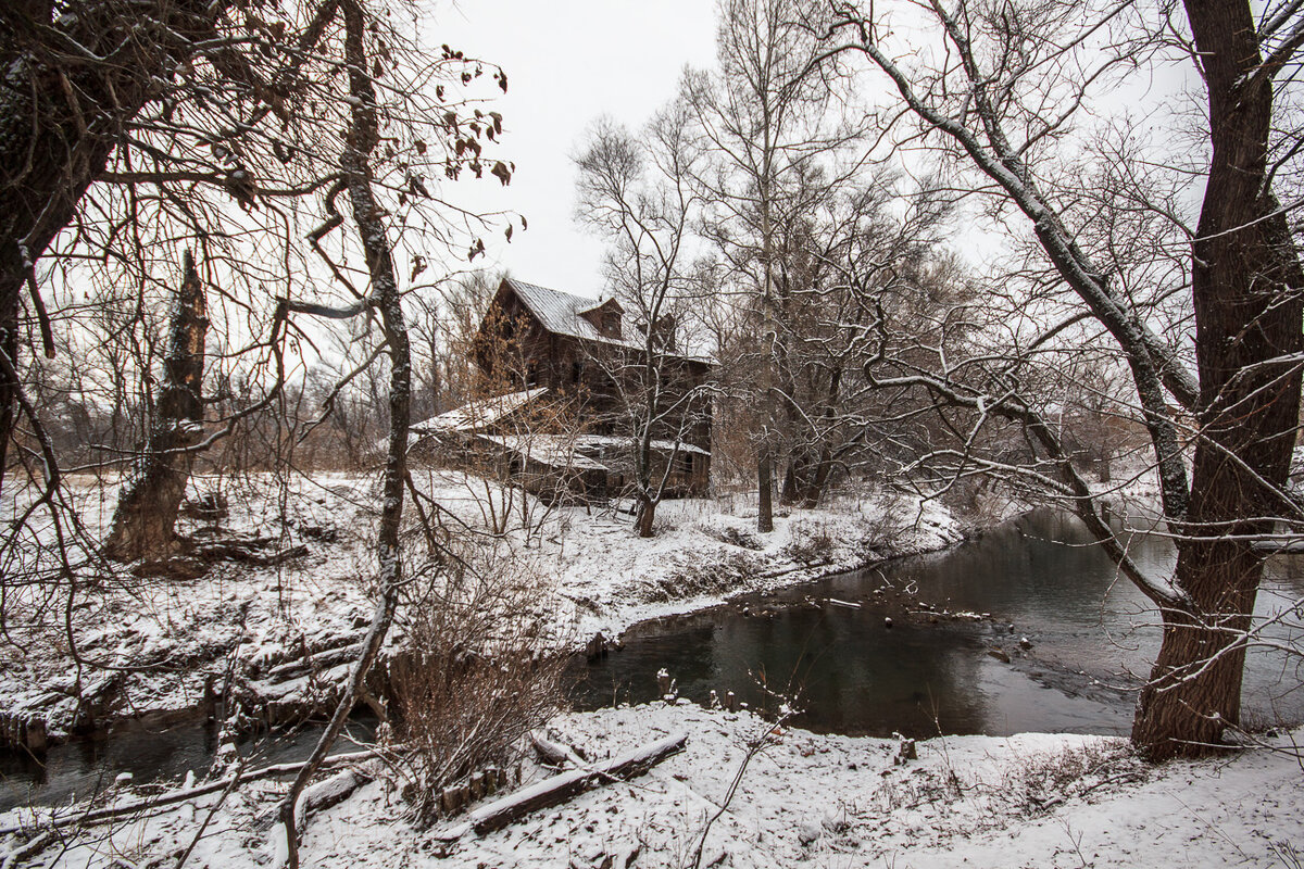 На дворе стояла середина ноября. Снег выпал уже второй раз и по всей видимости намеревался остаться с нами до апреля. Зима постепенно обретающая власть над этими землями напоминала о себе холодными запахами предстоящих холодов... Снег поскрипывал под сапогами нашей группы и дорога до интересующего нас места, казалось, не представляла никакой сложности, но внезапно возникшая водная преграда поставила крест на формате "легкой прогулки". Воспользовавшись смекалкой и огромным количеством строительного материала поблизости, всего за полчаса было сделано некоторое подобие моста, чьей надежности хватало, для переправки на другой берег всей группу. Подготовительные этапы закончены и вот уже вся группа переправлена на другой берег и разошлась по территории осматривая здешние конструкции. Место в которое мы прибыли, зовется мельницей Бушмарина и является одним из тех редких памятников деревянного зодчества которые сохранились в нашем крае. Полностью собранная из дерева, эта крупная, трехэтажная