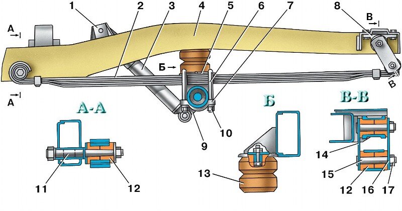 Есть несколько способов лифтовки: установка проставки под кронштейн серьги 8, установка более длинных серьг, установка проставки между рессорой и мостом с заменой стремянок 6 на более длинные.