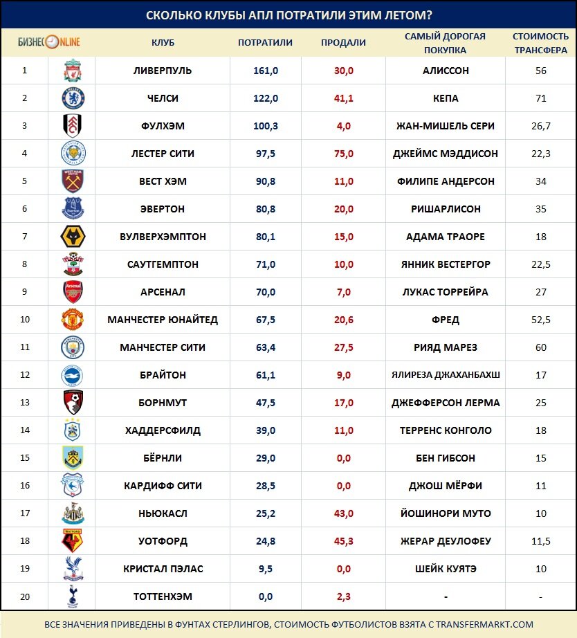 Мы уже привыкли к тому, что английские клубы тратят безумные деньги далеко на не самых звёздных футболистов. Например, в этом году шли разговоры о том, что «Уотфорд» после продажи бразильца Ришарлисона в «Эвертон» за 44 млн евро готов отдать 60 млн евро за полузащитника «ПСЖ» Гонсалу Гедеша. Во многом клубы АПЛ ведут себя столь неэкономно из-за выгодного телевизионного контракта. По информации Talksports, суммарно все английские клубы получили в нынешнем сезоне более 2 млрд фунтов. Худшей команде сезона, «Вест Бромвичу», лига выплатила 95 млн фунтов, а чемпион «Манчестер Сити» пополнил свою казну на 150 млн.