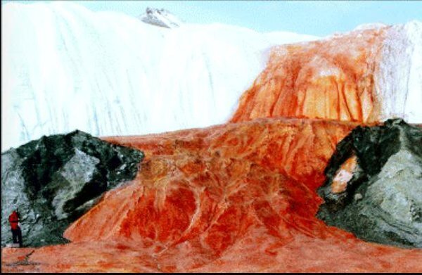 Называется он так, потому что действительно напоминает поток крови, стекающий с высоты с ледника высотой 30 метров. Первым обнаружившим его был исследователь из Австралии Гриффит Тейлор в 1911 году. Железо, большое количество которого содержится в воде, вступает во взаимодействие с кислородом и окисляется, приобретая цвет, напоминающий кровь. Но откуда водопад на вершине ледника? Ученые произвели разведку, используя специальный датчик, испускающий радиоимпульсы, и обнаружили большое подземное озеро. Через год было проведено бурение. Пройдя сквозь толщу льда, бур достиг озера, окрасившись в кровавый цвет. Сверхсоленая среда, которая изначально глушила радиоволны, оказалась благоприятной для некоторых микроорганизмов. Если прибавить к этому высокое содержание углеводов, очень низкую температуру и отсутствие света, адаптация этих организмов просто уникально к такой экстремальной среде. Это поможет ученым в поиске решений по освоению планет и миров с крайне неблагоприятными условиями для ж