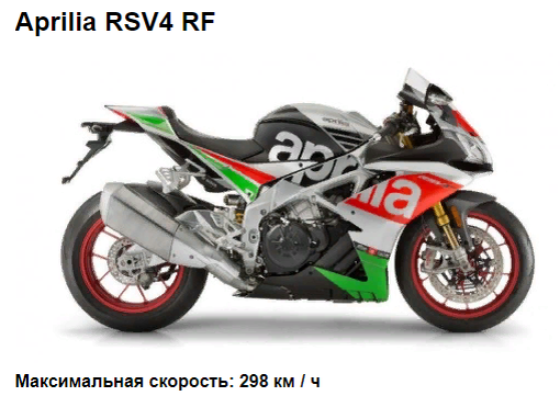 Максимальный крутящий момент составляет 115 Нм. Байк весит 180 кг. Но главная ценность спортбайка в его максимальной скорости, которая составляет почти 300 км/ч Байк MV Agusta F4 RR оснащен двигателем объемом 998 см³ мощностью 201 л.с. (максимальный крутящий момент 111 Нм). Самое интересное, что во всех каталогах максимальная скорость мотоцикла заявлена 300 км/час. Но на самом деле этот байк способен разгоняться на много быстрее. Правда речь идет о предыдущих моделях. Например, MV Agusta F4 RR 312