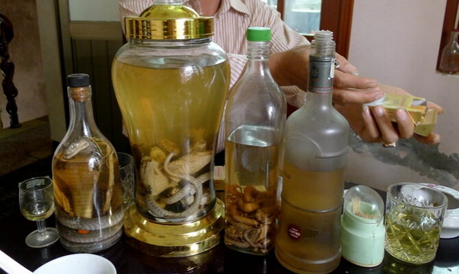 Лет пять назад мы с Геннадием были по делам бизнеса в Китае. Интересы бизнеса привели нас в городе Чанчунь. Когда уже все дела близились к завершению, решили заняться покупкой подарков. Чтобы удивить своих друзей купили по пять бутылок водки со змеями. У нас в России в ту пору об такой водке редко кто слышал, а попробовать ее и подавно никто не мог. Нам еще с университетских времен китайские студенты рассказывали о чудо водке со змеями, которую делают больше пяти столетий в провинции Гирин (Цзилинь). Однако секретом производства там не делятся с остальными производителями водки, рецепт хранят в глубочайшей тайне. Ребята говорили, что употреблять такой напиток можно только по грамм 30 и раз в день, как лекарство. Чудодейственный напиток повышает мужскую силу и излечивает от простудного кашля, увеличивает иммунитет и снимает стресс. Но это так называемое популярное в Азии дорогое лекарство продается в магазине. Поэтому, закупив, по пять бутылок змеиной водки мы приш