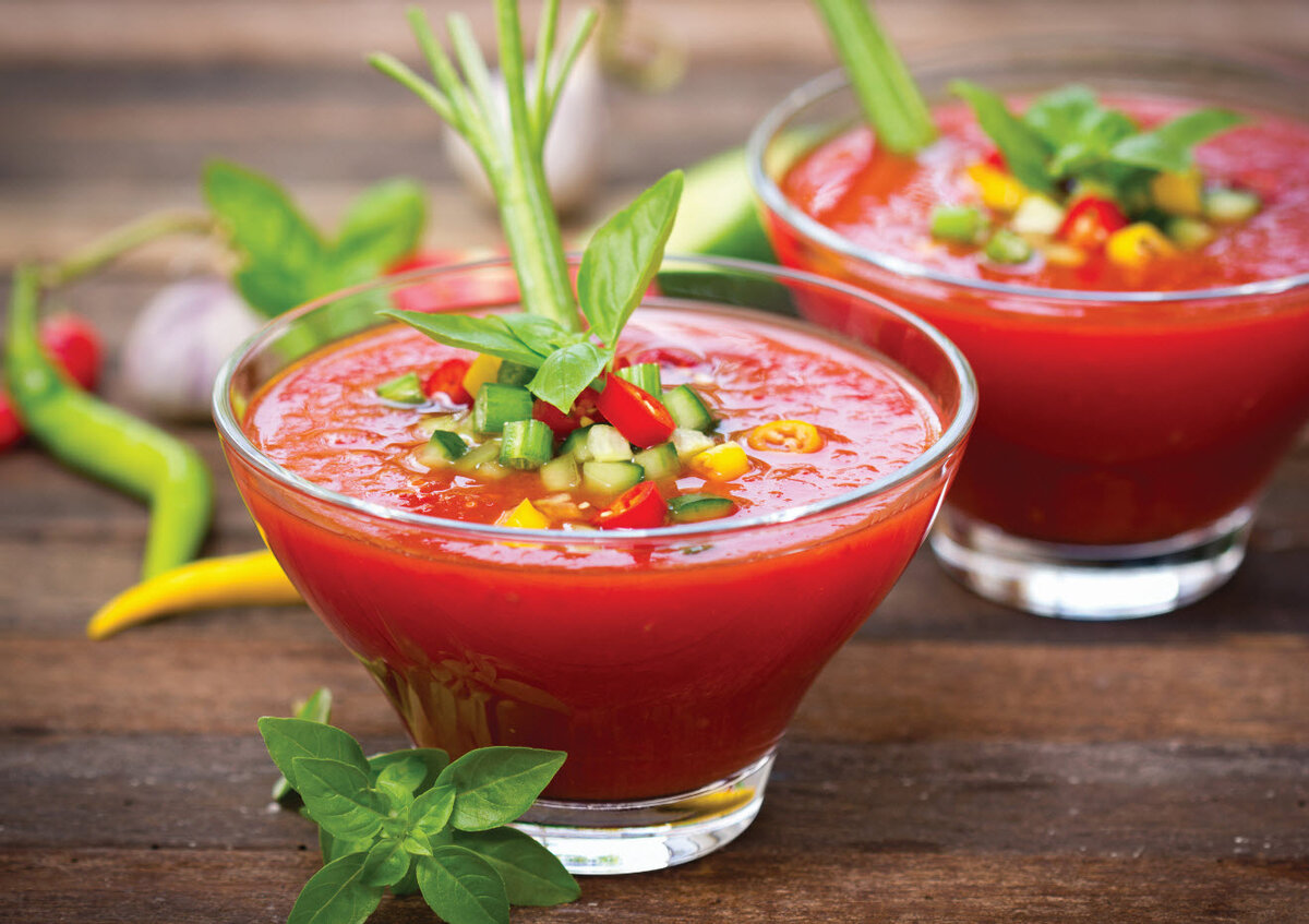 Летом так хочется чего-то освежающего и вкусного! Но тяжёлые, жирные и горячие блюда не подходят для летней трапезы. И всё же есть варианты, которые в тёплое время года позволяют насытиться, получить удовольствие. 1. Госпачо Это холодный, лёгкий и вкусный томатный суп. Для его приготовления потребуется килограмм свежих спелых помидоров, полкилограмма огурцов, 300 граммов болгарского перца, три зубчика чеснока, половина лимона, головка репчатого лука, молотый перец, соль по вкусу, две столовых ложки оливкового масла, зелень сельдерея, а также лёд. Помидоры и болгарский перец очистите от кожуры, предварительно обдав кипятком. Всё вместе измельчите в блендере или в мясорубке, добавьте сок половины лимона, оливковое масло, перец и соль, а также раздробленный лёд (его можно измельчить вместе с овощами). Украсьте суп рубленой зеленью. 2. Суп таратор Холодный суп таратор – пикантное и освежающее блюдо. Чтобы его приготовить, измельчите два крупных огурца, два или три зубчика чеснока и п