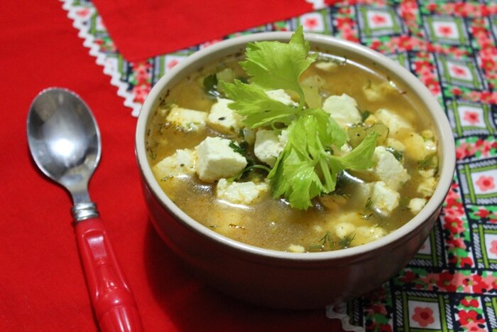 Необыкновенно вкусный, с низким содержанием углеводов, аппетитный – это куриный суп с рикоттой. Замечательный ярковыраженный аромат и пряный вкус ему добавляют душистые травы и особенно тимьян, богатый на полезности. Попробуйте приготовить по уникальному рецепту горячее блюдо на обед, и я уверена, Вам понравится – Вы получите тепло, сытость и прекрасное настроение! Подготовьте следующий набор продуктов: Одну большую луковицу Четыре стебля сельдерея 400г филе куриного без кожи, жира и костей Три зубчика чеснока или можно использовать чесночный порошок Одну ч.л. сухого тимьяна измельченного в ступке Одну ст.л. томат-пасты Три ст.л. смеси свежего укропа, петрушки и зеленого лука Одну ст.л. органического яблочного уксуса 200г рикотты, нарезанной кубиками (или больше для сервировки) Перец черный, гималайскую соль, куркуму, и любимые специи (кориандр, паприку и т. д.) – по желанию. Кухонный инвентарь, необходимый для данного рецепта: Кастрюля большая Маленькая кастрюлька Разделочная доска о