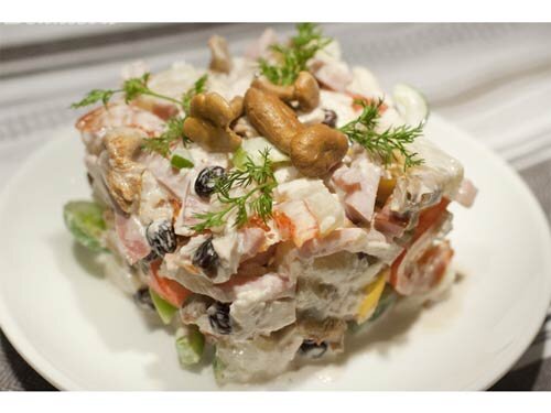 Креветочный салат с патиссонами Ингредиенты: Креветки опустить в подсоленный кипяток на 3 минуты. Остудить, очистить от панцирей и всего лишнего. Сбрызнуть готовые морепродукты свежевыжатым лимонным соком. Сварить яйцо до твердой серединки, а картофель и очищенные патиссоны – до мягкости. Нарезать их одинаковыми аккуратными кубиками. Высыпать в общий салатник. В эту же емкость отправить маринованные грибы. При необходимости измельчить их кусочками. Посолить соединенные компоненты, присыпать сахаром. Заправить их соусом. Хорошо перемешать. Выложить готовый салат горкой на плоскую тарелку. Украсить целыми вареными креветками. Для оформления закуски можно использовать и любую свежую измельченную зелень. Шефмаркет приготовил для Вас интересные рецепты блюд для всей семьи. Готовьте с удовольствием, а необходимые продукты мы привезем к вам домой! Салат с маринованными патиссонами и кальмарами Ингредиенты: Тушку кальмара обдать крутым кипятком. Снять с нее сразу свернувшуюся пленочку. Избав