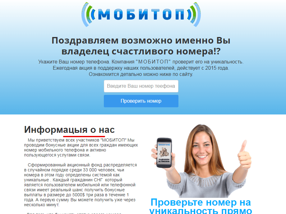 МобиТОП – компания, которая проводит бонусные акции для всех абонентов, имеющих номер мобильного телефона и активно пользующихся услугами связи. Претендовать на вознаграждение в размере до 5000$ могут граждане СНГ, чьи номера были определены системой как «Уникальные». Счастливчики получат выплаты целых три раза в течение одного года. Проверить свой номер на принадлежность к числу избранных можно сразу после знакомства с условиями проекта. Участившиеся случаи мошенничества, связанные со всевозможными акциями для владельцев мобильных телефонов, заставляют нас проверить сделанные заявления на подлинность и платежеспособность.