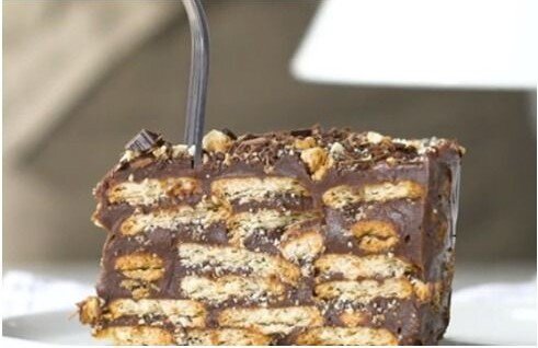 Для приготовления потребуется: 500 г песочного печенья 300 г сахарного песка 3/4 стакана воды 1 стакан сухого молока 100 г какао-порошка 100 г орехов 200 г сливочного масла Способ приготовления: 1. Вскипятить воду с сахаром. 2. Смешать сухое молоко с какао и растертым сливочным маслом, 3. Влить вскипевший сироп, хорошо перемешать. 4. Печенье уложить в форму, предварительно застелив ее листом пергамента. Укладывать печенье надо так, чтобы не оставалось пустого пространства. 5. Смазать горячим кремом, затем снова положить плотным слоем печенье, покрыть кремом, и так чередовать до тех пор, пока не кончится печенье. 6. Последний слой покрыть подогретым кремом и сверху посыпать измельченными орехами. Поставить торт в холодильник. Приятного чаепития!