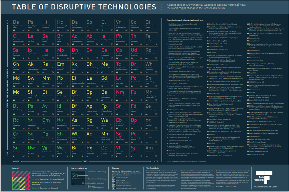 Ученые из Imperial Tech Foresight работают над созданием периодической системы технологических открытий. Сами ученые называют её "TABLE OF DISRUPTIVE TECHNOLOGIES" (Таблица разрушительных технологий). В таблице представлены 100 технологий, которые изменят мир в обозримом будущем. Правда часть технологий уже существует, они в таблице обозначены зеленым цветом, желтым обозначены технологии, которые могут появиться в ближайшие 10 лет, красным 10-20 лет и серым невероятные технологии, но необязательно невозможные. Ось Y означает на сколько опасна технология в социо-экономическом плане. Ось X время которое потребуется для открытия технологии. Если начать разбираться станет ясно - вдохновлялись создатели таблицей Менделеева. Менделеев предсказал открытие новых элементов систематизировав уже известные. Если пофантазировать, то можно представить существование системы, вписав в которую уже существующие технологии, станет понятно, что еще не открыто и как это сделать. Пока это только фантази