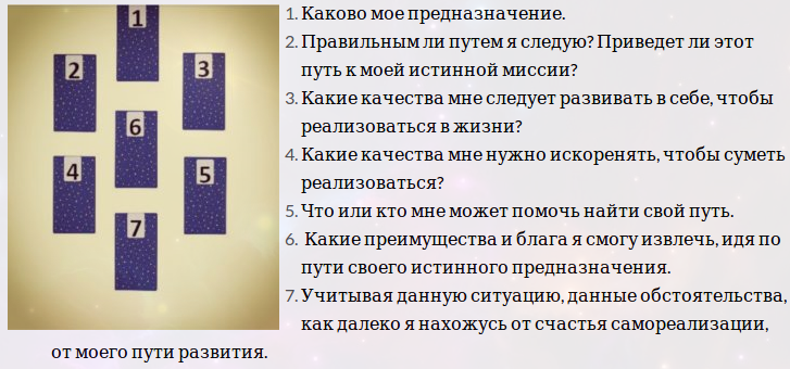 Кверент: Мне интересно, в какой сфере заниматься, зарабатывать. Или предназначение. Я: Вы можете написать мне список вариантов, и я вытяну по карте на каждый. Или подбираем расклад, тут уж как хотите. Про предназначение можно сделать, например, этот. Кверент: По этому можете попробовать? Я: Да. Я: Скажете какие-то свои ассоциации, или начать мне? Кверент: Начинайте. Я: П.1, каково ваше предназначение - карта Невинность, изображает мудрого старика. Стать человеком опытным и знающим. Кверент: Ок. Опытном в какой сфере именно? Я: Но я же предлагал вам вариант составить список этих сфер, и я бы вытянул по карте. Вы предпочли расклад. А расклад немного про другое говорит, там нет такой конкретики. Кверент: Ок, потом сделаем , давайте дальше, пожалуйста. Я: П.2, правильным ли путем вы следуете - Гармония. Да, совершенно правильным. Кверент: Ок. Я: П.3, какие качества вам следует развивать - Внутренний Голос. Умение прислушиваться к себе. Кверент: Ок. Я: П.4, какие качества надо искоренять -