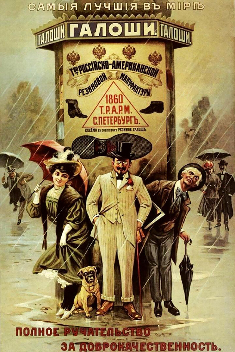 Рекламные плакаты в Российской империи были настоящими художественными шедеврами, изображающими живописные исторические битвы или эпизоды из славянской мифологии. 1. Реклама для калошей компанией ТРАРМ, первой российской резиновой фабрикой. «Гарантия полного качества», - говорит плакат. 2. Плакат рекламирует сигареты компании Богданов и Ко. Они был выпущен во время русско-японской войны (1905) и намекают, что только настоящие герои курят такие сигареты. 3. Летающий корабль из русских сказок на этом плакате рекламирует «Международную выставку новейших изобретений», которая проходила с апреля по июнь 1909 года. 4. Реклама продуктов от пивоваренного завода Вайнера, расположенного в южнорусском городе Астрахани. 5. Плакат рекламирует самолеты и гидросамолеты ведущего авиастроительного завода Артура Анатра, расположенного в Одессе. 6. Рекламный плакат резиновой фабрики ТРАРМ. 7. Завод Колобова и Боброва использовал образ знаменитого российского генерала Михаила Скобелева для рекла