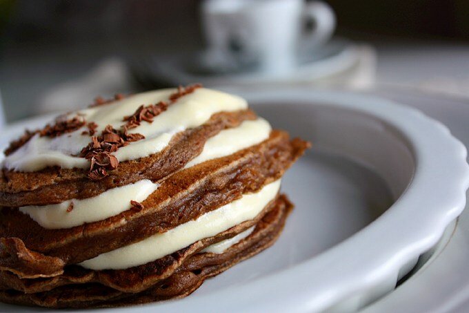 Сперва приготовим крем. Для этого все ингредиенты для сливок взбейте до воздушных пиков. Поставьте в холодильник. Затем приступаем к приготовлению блинов. В миске смешайте муку, сахар, какао-порошок, разрыхлитель, соду и соль. В отдельной миске смешайте молоко и сметану до однородной массы. Добавьте эспрессо, вбейте яйца, растопенное масло и ванилин. Смешайте молочную смесь с сухими ингредиентами и убедитесь, чтобы не осталось комочков. Если тесто слишком жидкое, доабвьте еще ложку или