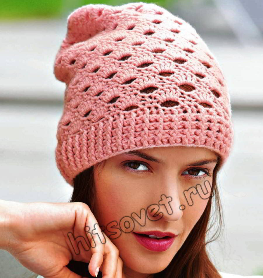 Модная шапочка с дырочками связанная крючком со схемами и пошаговым описанием вязания. Единый размер. Вам потребуется: 3 мотков розовой (цвет № 296.261) пряжи Bergere de France Cachemire, состоящей из 90% кашемира, 10% шерсти, длиной нити 70 метров в 25 граммах; крючок № 3,5. 1 выпуклый столбик с накидом: связать 1 столбик с накидом, обводя крючок вокруг столбика с накидом предыдущего ряда перед работой. 1 вогнутый столбик с накидом: связать 1 столбик с накидом, обводя крючок вокруг столбика с накидом предыдущего ряда за работой. 2 столбика с накидом, провязанные вместе: сделать 1 накид, ввести крючок в петлю, 1 накид, вытянуть петлю, 1 накид, пропустить нить через 2 петли на крючке, сделать 1 накид, ввести крючок в следующую петлю, 1 накид, вытянуть петлю, 1 накид, пропустить нить через 2 петли на крючке, затем сделать ещё 1 накид и пропустить нить через последние 3 петли на крючке. Описание и схема шапочки