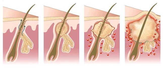 Как это выглядит? Кожно сало скапливается в канале сальной железы и из-за омертвевших клеток кожи не может выйти на поверхность, в результате воспалительный процесс начинается под кожей. Попытка выдавить такой прыщ не приведет ни к чему хорошему. Во-первых, скорее всего у вас ничего не получится, вы только повредите кожу. Возможно даже образование рубцов из-за механического воздействия. Во-вторых, если прыщ белый, значит внутри содержится гной, и при надавливании есть шанс, что гной попадет в кровь, а это может привести к заражению крови и только сильнее распространит сыпь.
