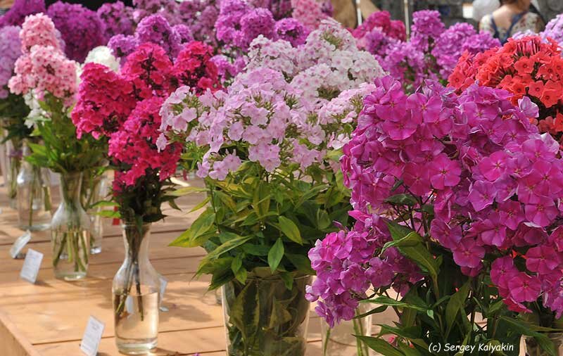 На прошедшей 2 и 3 августа выставке флоксов в Аптекарском огороде лучшие сорта выбирали и жюри, и зрители. Сначала об итогах работы жюри. 1. ‘Краса России’ (Е. Константинова) был признан лучшим сеянцем. Все при нем: и цвет, и плотная фактура лепестков, и четкая колесовидная форма цветка, и крупные, аккуратно сложенные соцветия. Еще раз обратим внимание на цвет – насыщенный пурпурный с коричневатым оттенком, который очень эффектно смотрится в саду и оставляет свободу действий в подборе партнеров в цветнике. 2. ‘Раймонда’ (Е. Константинова) завоевала серебро в первую очередь благодаря идеальному соцветию. Этот флокс с некрупными цветками перламутрового оттенка можно назвать хамелеоном: окраска меняется в зависимости от освещения. Он то розовый, то лиловый, то серебристый, переливчатый... утром один, днем другой, вечером третий. 3. ‘Стандарт’ (Е. Константинова) был выделен в качестве добротного флокса в расхожей цветовой гамме (сиренево-лиловый с белым центром). К безусловным достоинствам