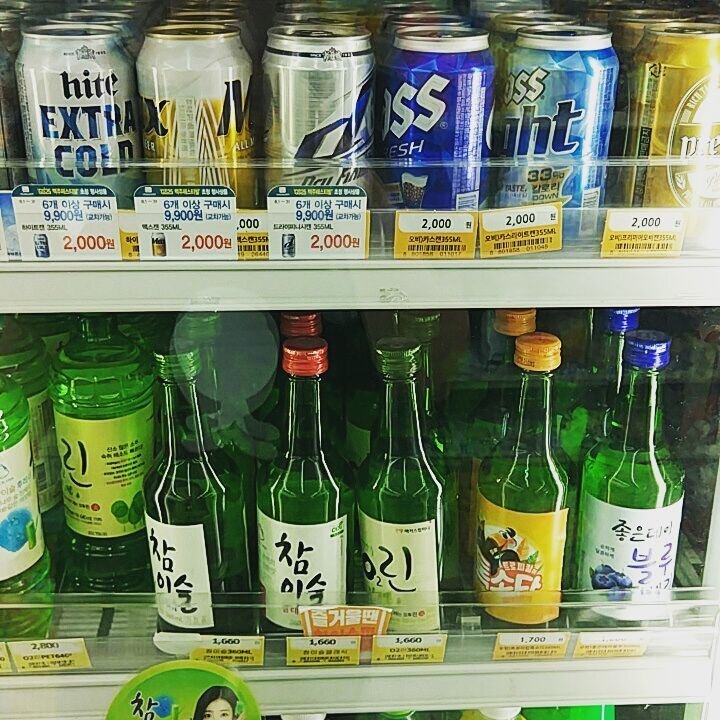 Весь мир считает, что русские - самая пьющая нация. Это они еще корейцев не видели. Корейцы действительно много пьют. Много и часто. И все. Начиная от студенток и заканчивая стариками. Девушки в Корее практически не курят. Это считается максимально некрасиво и сразу создается впечатление о курящей девушке как о девушке легкого поведения. Но выпивают они вполне спокойно. Как у нас отнесутся люди, если милая молодая девушка внезапно предложит пойти побухать, аргументируя это тем, что уже давно не пила. Согласитесь, негативный оттенок присутствует. А в Корее это считается абсолютной нормой. Люди так отдыхают, расслабляются. Что же пить в Корее? Алкоголь продается в обычных продуктовых магазинах и это выглядит так: Фото моё. Сверху в алюминиевых банках, как вы могли догадаться, пиво. Корейское пиво не имеет ничего примечательного. Обычное светлое фильтрованное слабенькое пиво. А вот ниже у нас идут веселые стеклянные бутылочки. Этот напиток называется соджу или 소주. На вкус он как выве