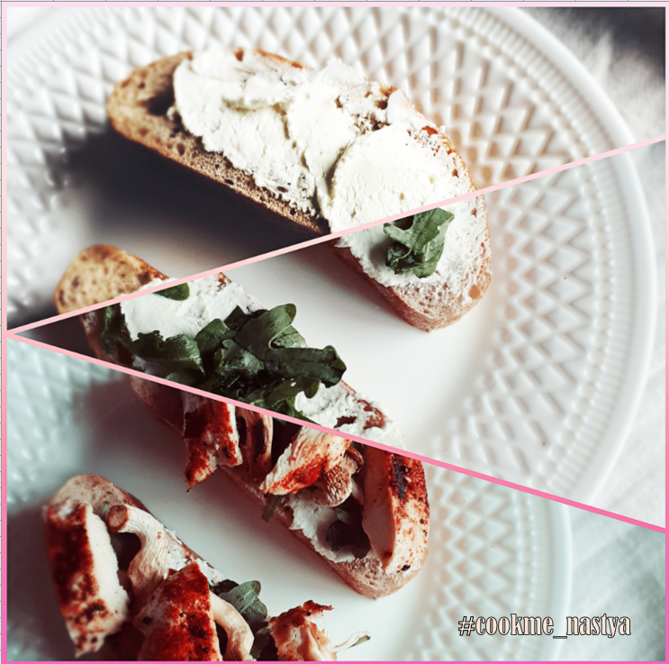 Как говорится, всё гениальное просто! Вкусный, быстрый завтрак и минимум усилий. Самое трудоёмкое - это курица. Но настоятельно рекомендую завести привычку: 1-2 раза в неделю выделять вечером 10 мин на её приготовление. За подробностями листайте до конца. # На сухой сковороде поджариваем багет (либо в тостере - я свой сломала, уронив туда лопатку). На заметку: на сковороде гриль меньше вероятность, чтоб хлеб подгорит. # Смазываем хлебцы вашим любимым творожным сыром - я "подсела" на турецкий Labne, мне нравится соотношение цена-качество. # Далее руккола - или ваша любимая зелень - мне кажется, её пряный вкус тут отлично заходит. # А теперь самое интересное - курица. По поводу полезных привычек: покупаете куриное филе, разрезаете вдоль каждую грудку (чтобы была тоньше и быстрее готовилась), по желанию маринуете с утра, а вечером обжариваете на раскалённой сковороде гриль по 3 мин с каждой стороны. Выключаете огонь и ещё 7 мин под крышкой. У меня курица жарилась с свежемол