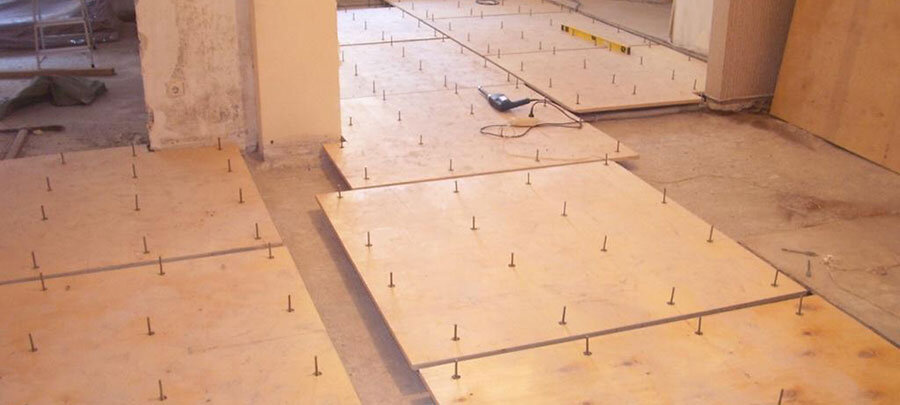 После завершения обустройства чернового пола необходимо подготовить его к укладке финишного покрытия. Речь, прежде всего, идет о выравнивании. Проще всего данная задача решается за счет установки фанерного слоя. Фанера обладает достаточным уровнем прочности и сохраняет функциональные характеристики в течение длительного срока.